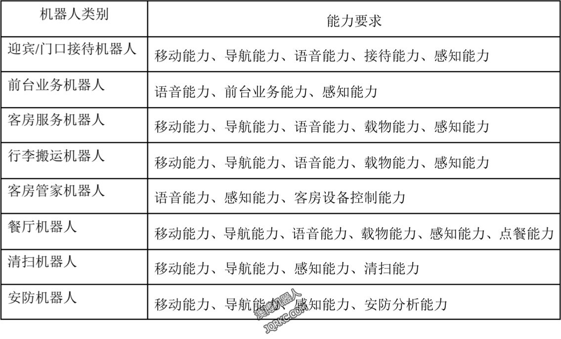 具體來說,一個酒店內交由效力機器人結束的工作包含了八項,對應八類不一樣的效力機器人,而這八類效力機器人的才干懇求也不一樣。